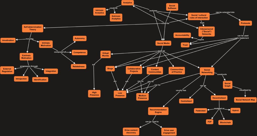 The concept map was a bit of a challenge. From where I sit right now, I can certainly identify some concepts, but not as many as I would have thought. I feel like a lot of my exploration during this course has been less about learning entirely new concepts, and more about the exploration of existing concepts. Plus a bit of the usual (for me) gluing together of thoughts and insights across various areas. (And honestly, I think the thing I learned that excites me the most is the section on self-determination theory! That little section alone is going to be something I’m digging into for years, honestly!)
